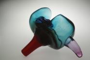 MediumGlas: Selenrotes Glas durchblasen, azurblau überstochen, formgeblasen, flachgedrückter, massiver Glasposten und kleines, frei geformtes, hellviolettes Glashorn angesetzt, perforiert